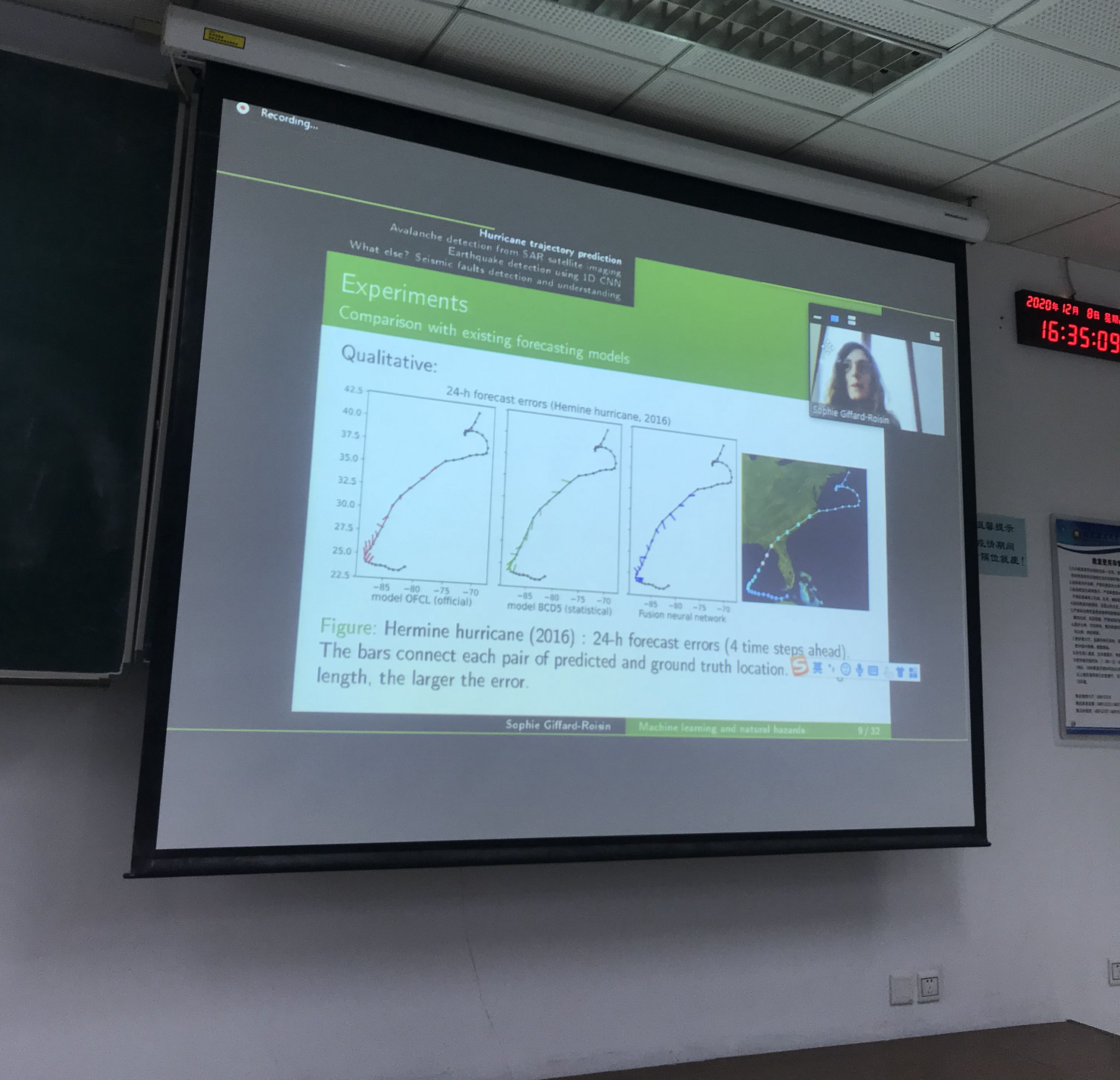 Sophie Giffard-Roisin在报告中概述了机器学习近年来发展历程,剖析了地质灾害监测方面主要存在的问题,并深入介绍法国格勒诺布尔阿尔卑斯大学地质科学研究所在使用机器学习在地质灾害方面进行应用的主要方向,如飓风路径预测,雪崩预测等。报告结束后,Sophie Giffard-Roisin研究员与在座的师生们就机器学习在地质科学应用中存在的问题与发展前景进行了热烈的讨论。Sophie Giffard-Roisin研究员的报告图文并茂,深入浅出,为在场的师生们带来了一场顶级的交叉学科学术盛宴。