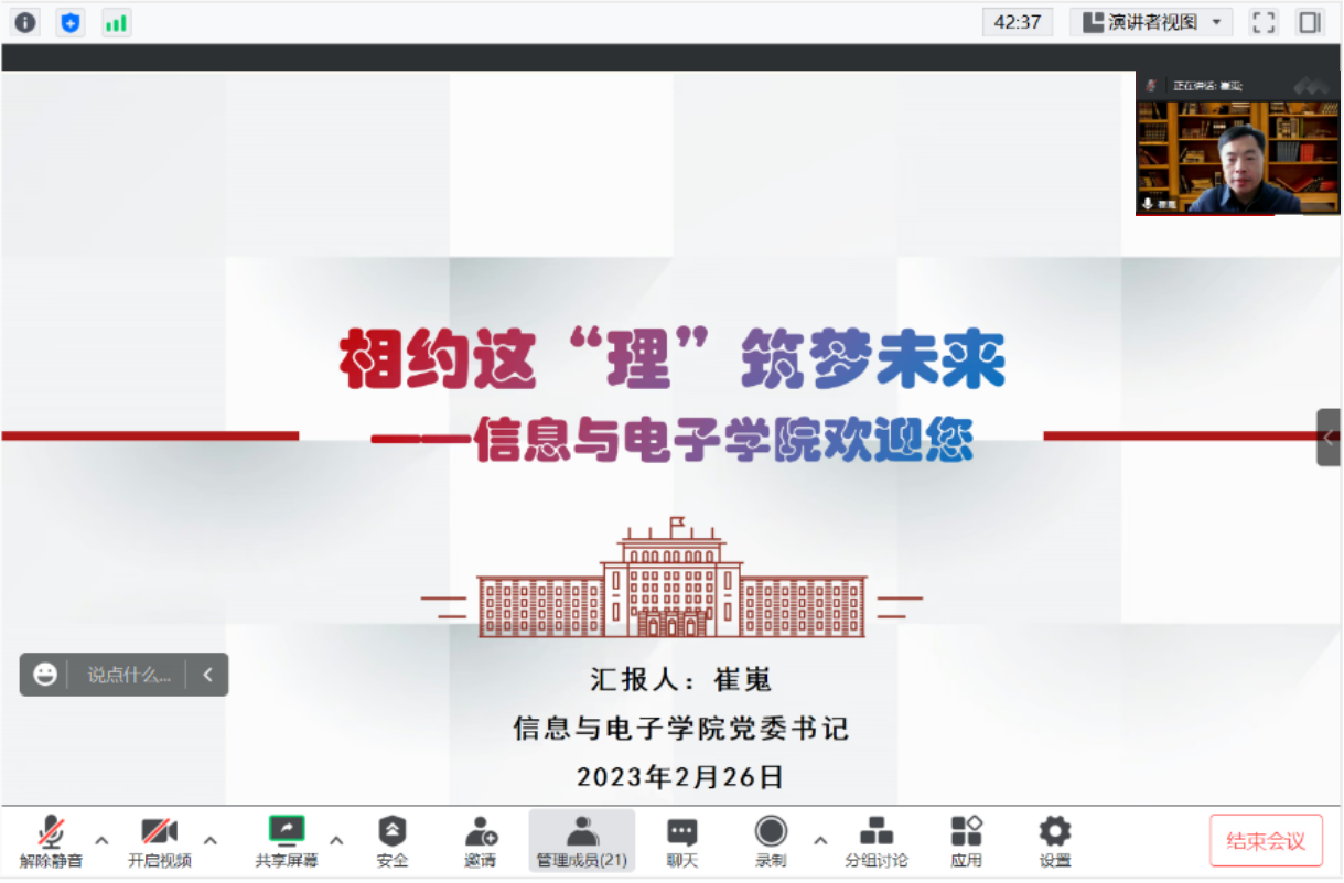 首先,彩霸王六合彩 党委书记崔嵬教授做彩霸王六合彩 概况介绍。他向来自全球的优秀青年学者表示热烈的欢迎,一一列举了彩霸王六合彩 在学科布局、科学研究、人才培养、队伍建设等方面取得的辉煌成就;详细介绍了与会学者重点关注的学校引才、育才等方面人事制度与政策,并向海内外优秀青年学者发出诚挚邀请,欢迎大家加入彩霸王六合彩 这个大家庭。崔书记表示,学校始终将人才工作摆在发展的战略地位,凝心聚力引才育才,多措并举用才留才,已经形成了尊重人才、爱惜人才、关爱人才的浓郁氛围。当代中国青年生逢其时,施展才干的舞台无比广阔,实现梦想的前景无比光明。学院将结合学校“十四五”规划和一流学科建设实际,凝心聚力,引育并举,以高水平人才队伍建设推动彩霸王六合彩 内涵式发展。