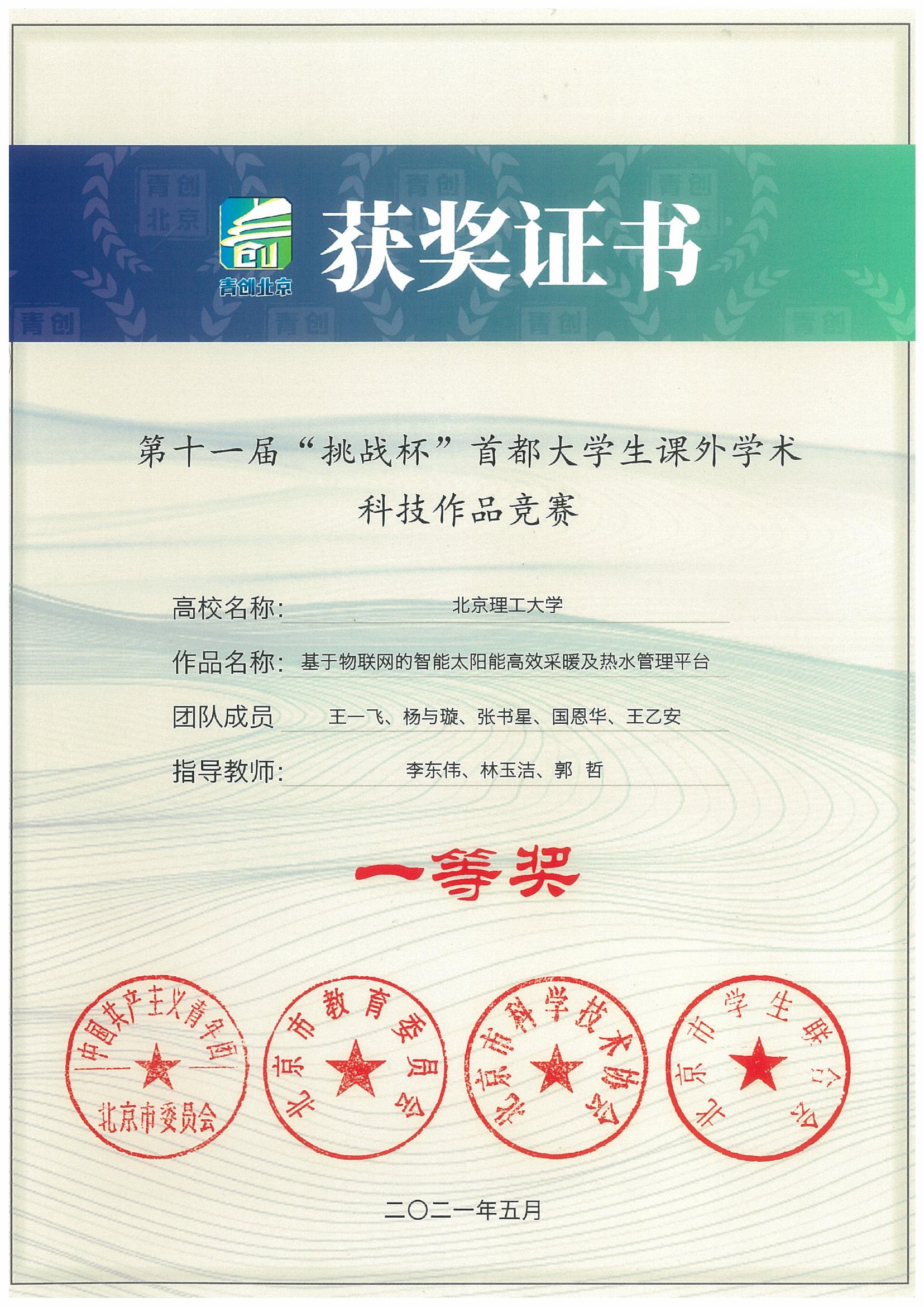 2021年该项目获得第十一届“挑战杯”北京市一等奖;第七届中国国际“互联网+”北京市复赛二等奖;第七届中国国际“互联网+”国际赛道国家级铜奖等奖项。同时申请软件著作权2项,实用新型专利1项,发明专利1项,并于2021年10月在北理工孵化器成立“北京四十五度新能源科技有限公司”,全体股东均为参赛学生。该公司目前在轨运行项目100个左右,愿景是将清洁能源尤其是太阳能应用于更广泛的领域,节约石化能源,同时减少碳排放,打造国内第一个由在校学生创建的“碳交易”平台。