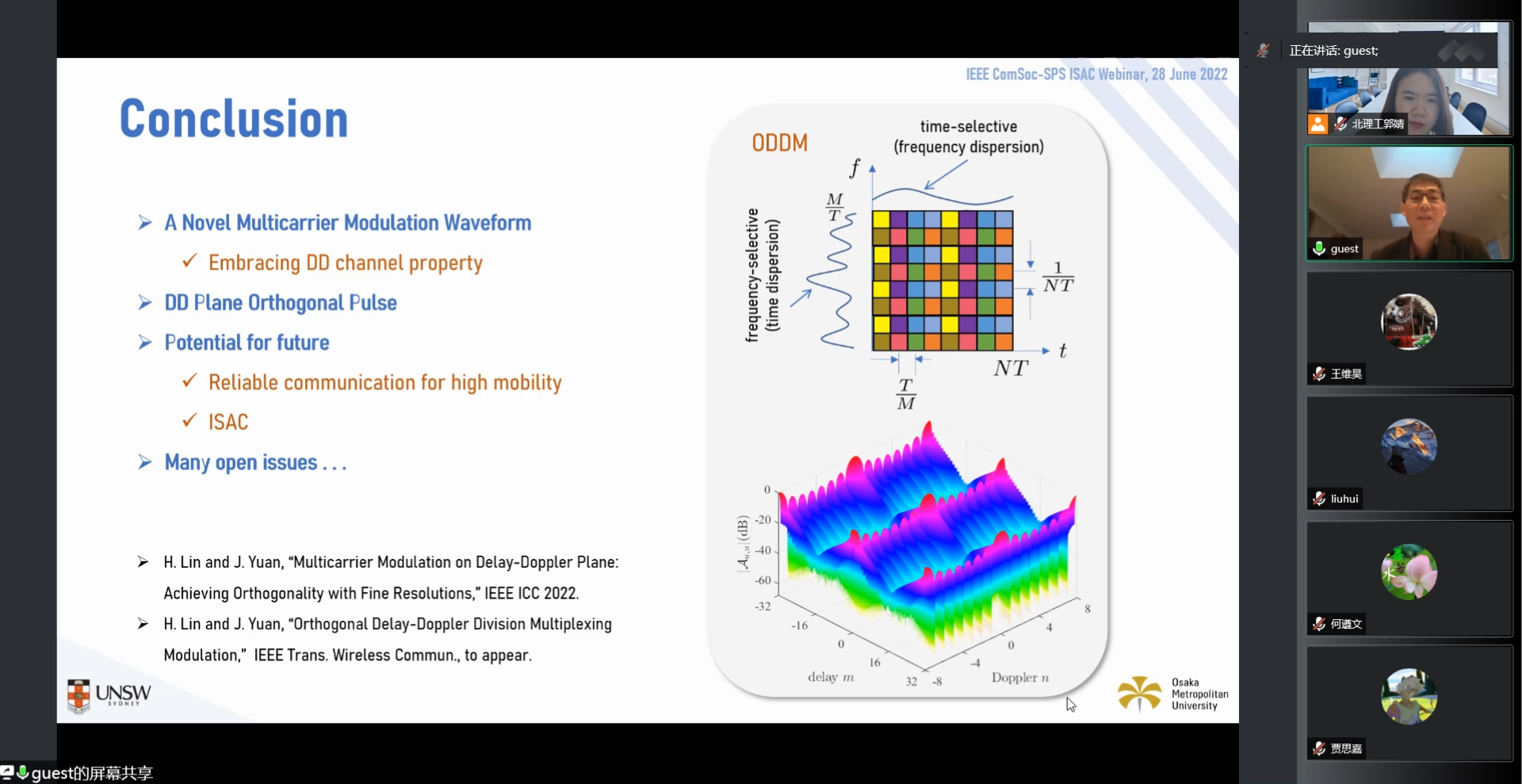 原教授首先回顾了正交时频空间调制(OTFS)的原理及时延-多普勒域信道的表征,深入浅出地介绍了波形设计的基本原理,紧接着针对OTFS存在的问题提出了时延-多普勒域多载波调制波形(ODDM),并对ODDM波形的特性和优势进行了详细的分析,阐述了该波形在感知通信一体化领域的广泛应用前景。