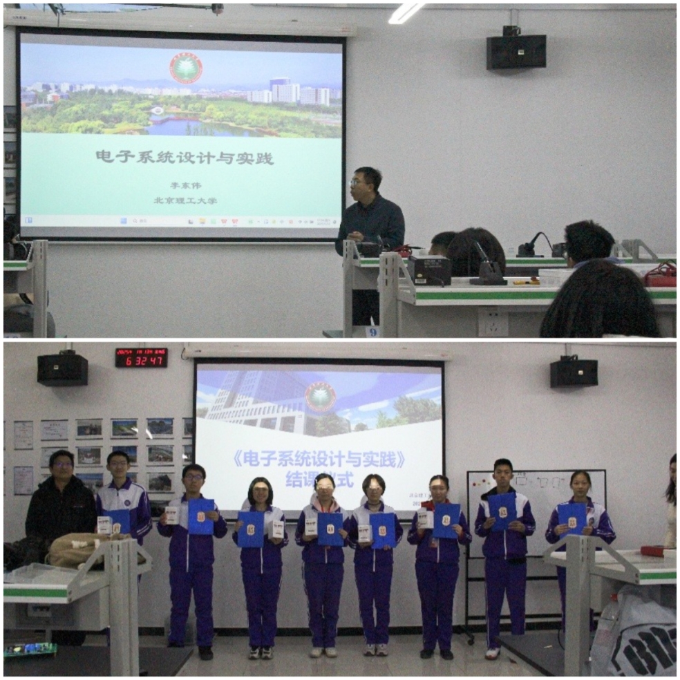 在《电子系统设计与实践》实验课堂上,彩霸王六合彩 专任教师李东伟深入浅出的为学生讲授电子信息基础知识,全体师生积极参与到实验活动中。课后,授课教师为顺利结课的南开中学学子颁发结课证书。